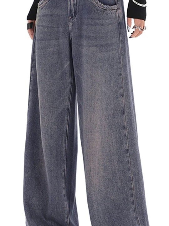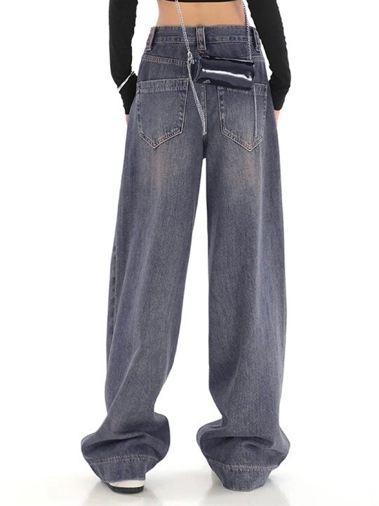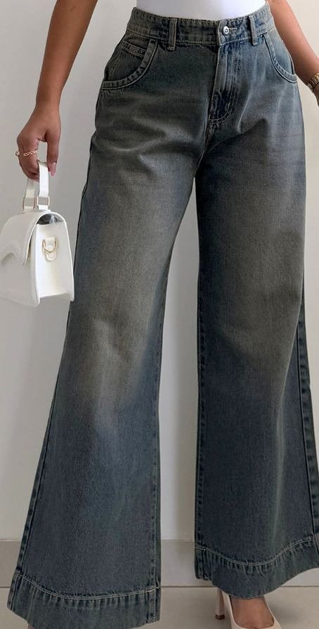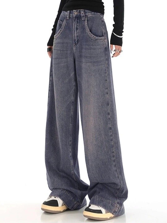 These medium-shade blue jeans feature a heavy fade and subtle cat-scratch distressing. Designed with a mid-rise waist and wide-leg fit for a relaxed, trendy silhouette. Crafted from non-stretchable cotton for durability and classic denim texture. Includes five pockets, belt loops, and a secure button-fly closure. Easy to maintain — machine washable; model (5’8″) wears size 28.